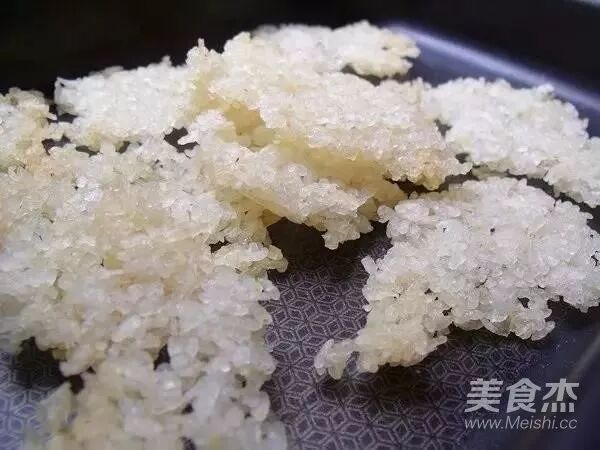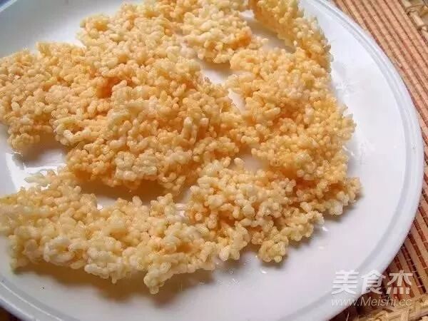 锅里下大量油烧至九成热(可以丢入一小块锅巴测试,迅速蓬发油温即合适),下锅巴炸至蓬发偏淡黄色。