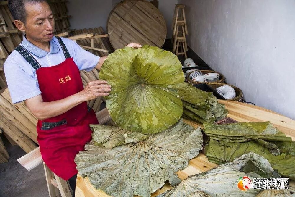 6、用碗把和有作料的猪肉倒入荷叶中,包扎成下圆上尖的“状元帽”形状、元宝形或者四方形。