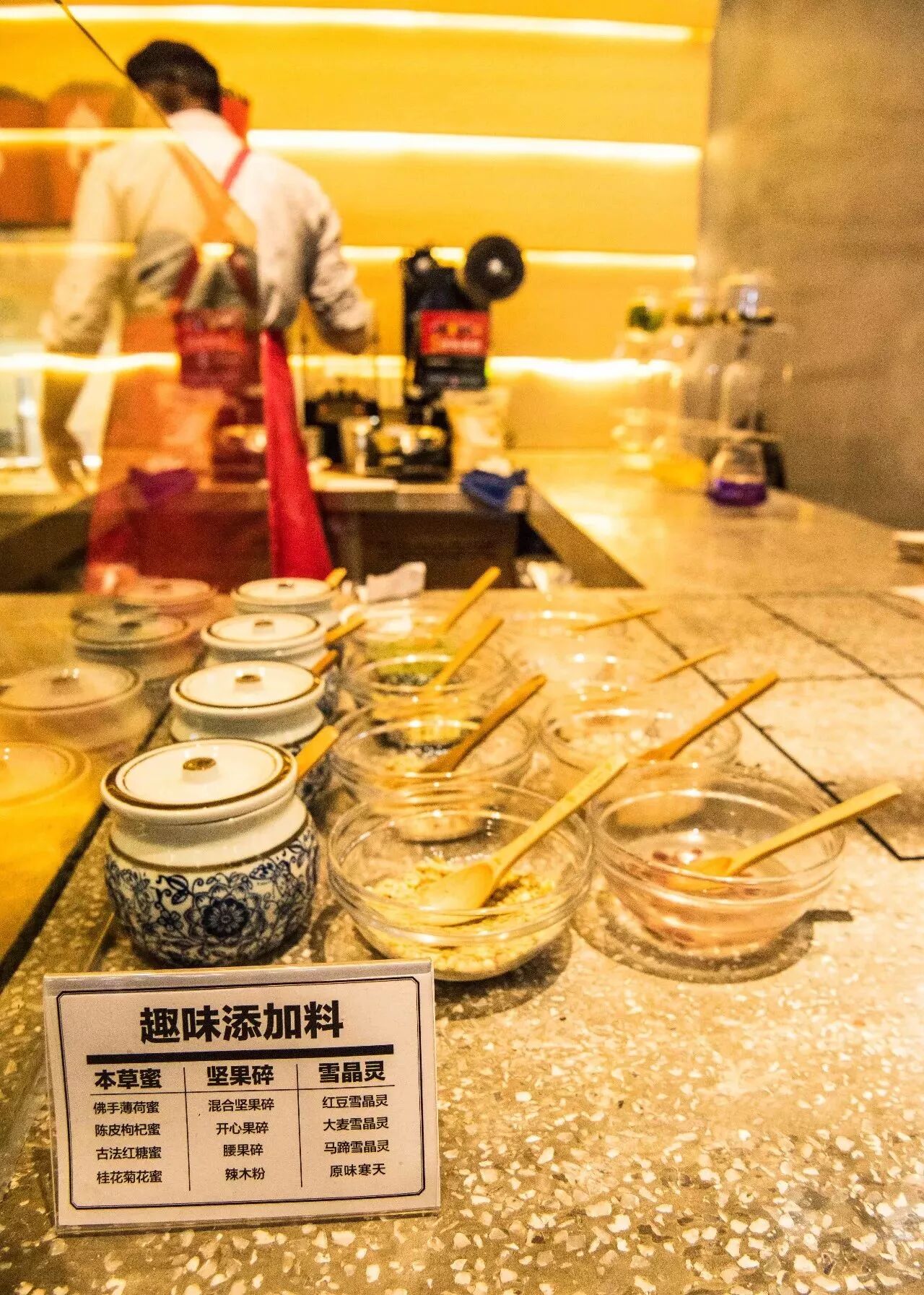 不仅凉茶可以定制,甜品也可以定制哦!甜品可以在“吉乐加”这里免费加料:独家秘制的本草蜜、坚果碎和雪晶灵加起来12种选择,为甜品增添更多不一样的风味~