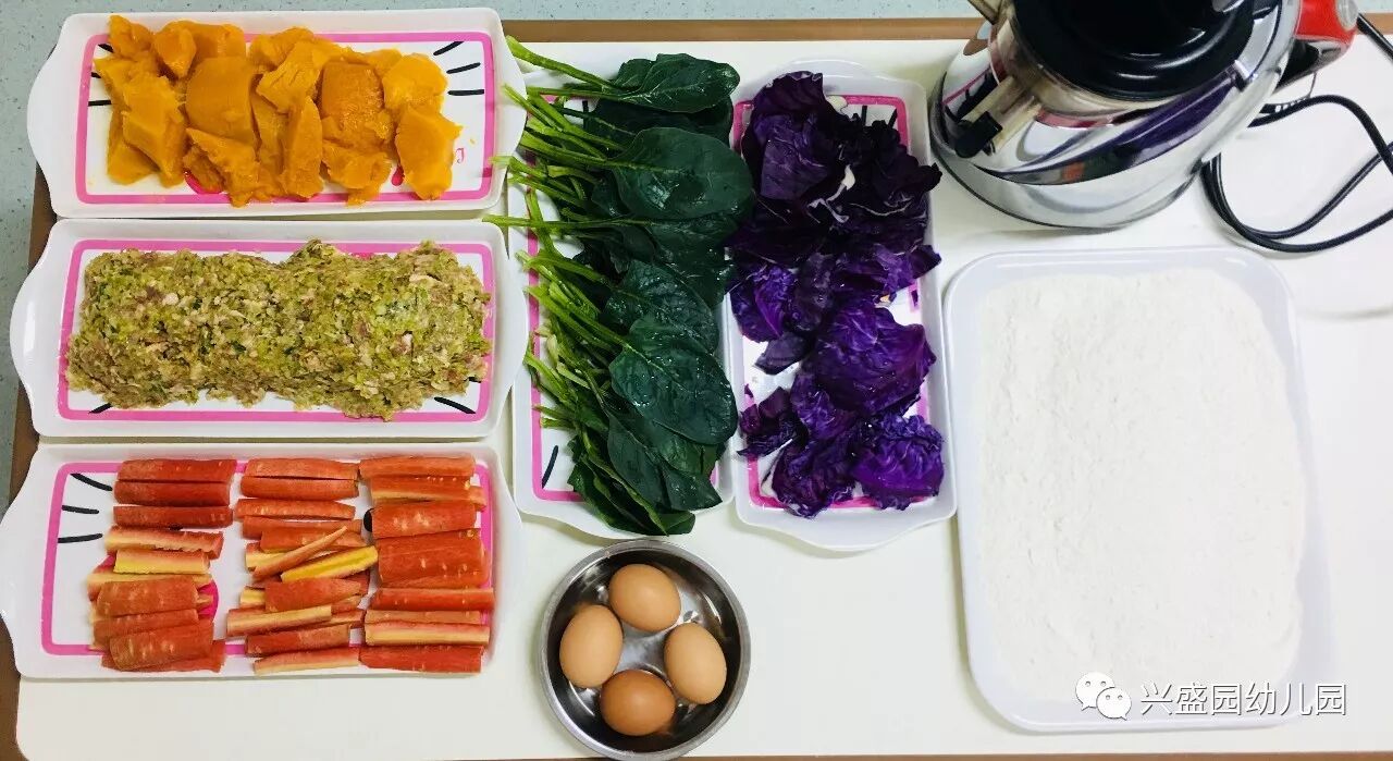 面粉、水、紫甘蓝、菠菜、莲花白、大肉、胡萝卜、南瓜(熟的)、五个鸡蛋、盐、生抽、香油、花椒水。