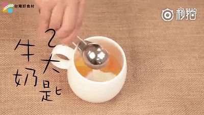 如图所示,用勺子将杯子内所有食物充分打散搅拌均匀。