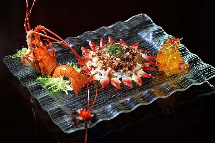 澳龙虾1只蒸熟起片,浸柠檬冰水10分钟;红赤贝放入调味料拌好,装盘即可。