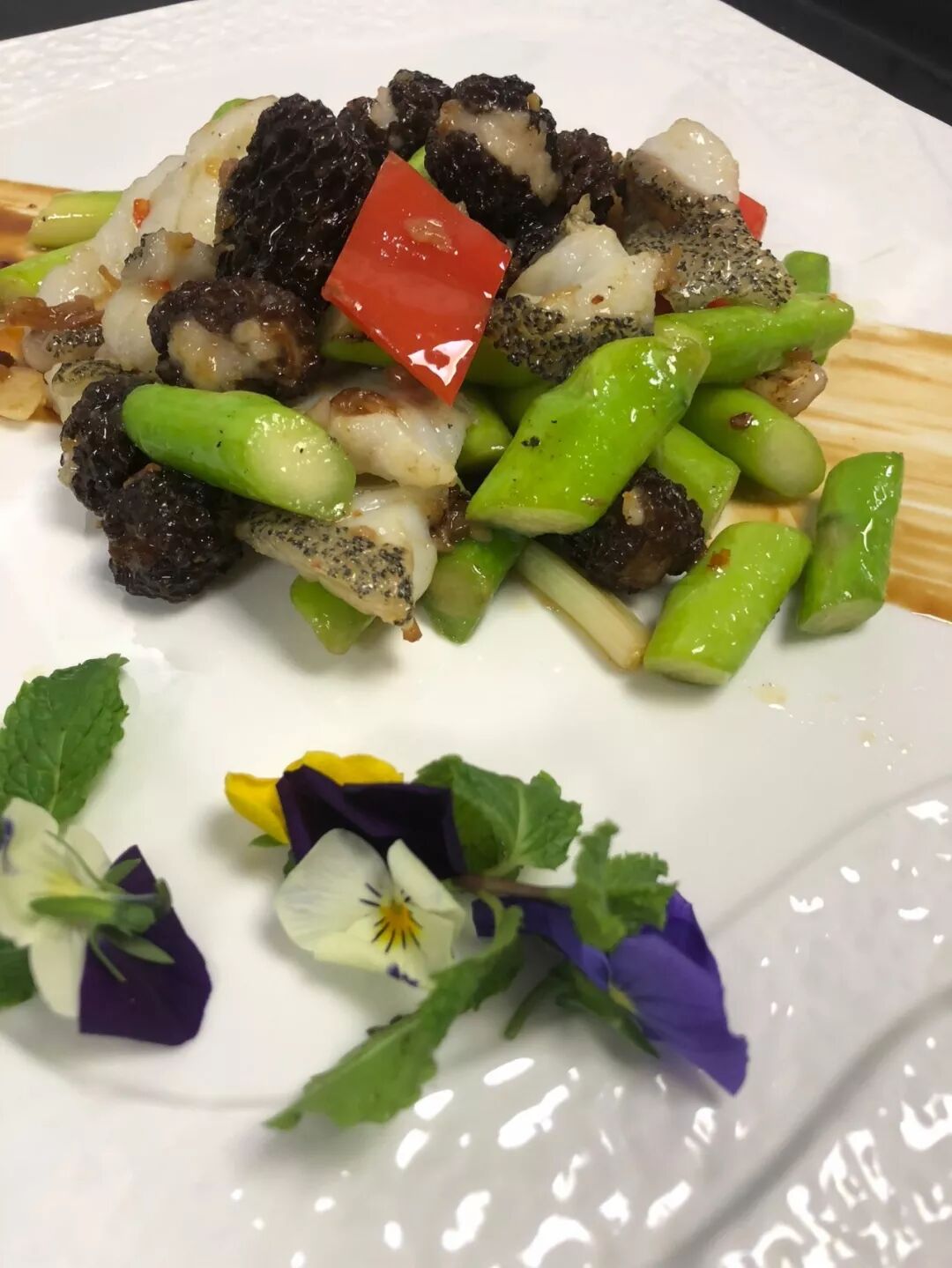 老虎斑1条1000g,羊肚菌25g,虾胶100g,白芦笋150g。