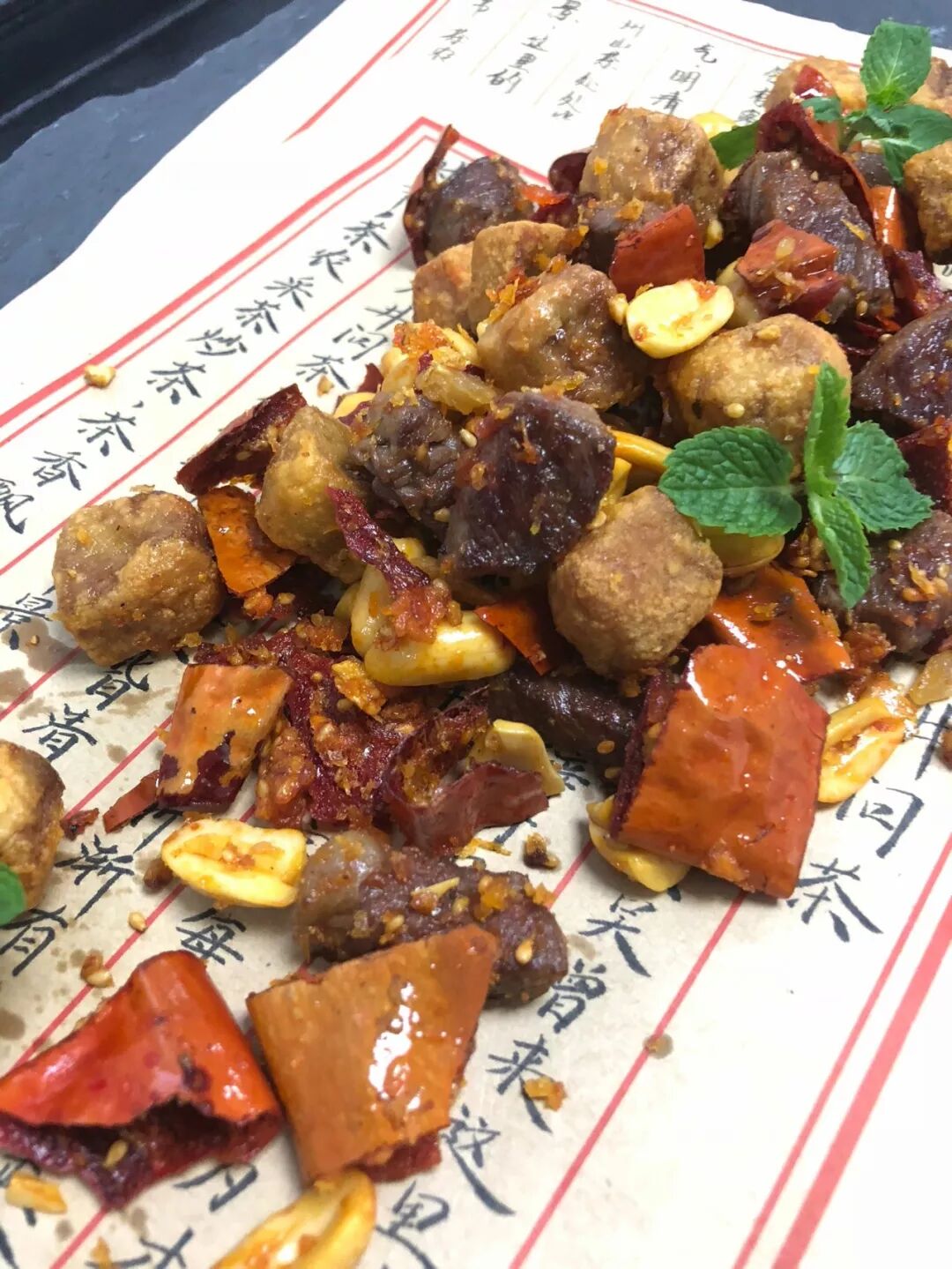 3.然后脆椒起锅炒香,放牛肉一起炒均匀,炸好的鹅肝放上面即可。