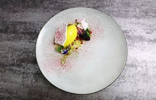 3. 将冷冻完成的芒果冰激凌放入Pacojet机器中,制成顺滑状态,用勺子挖出橄榄形状,放入盘中冰霜上,再搭上蛋白片及蓝莓、桑葚和红加仑。