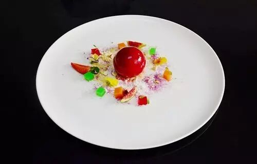 3. 将混合紫罗兰糖、混合坚果碎撒入盘中,在盘中间放入树莓香草慕斯球,最后放入多味啫喱冻与草莓、无花果装饰鲜花即可。