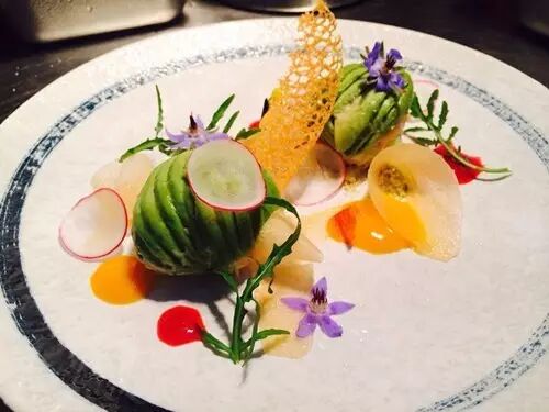 主菜盘中抹上红菜头泥,上面放5片扇贝薄片、日本甜虾、真空蜜瓜片,最后放红菜头叶装饰。