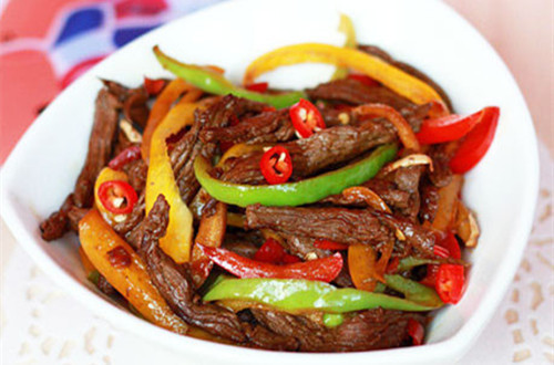 1、将牛肉洗净切成长8厘米、宽4厘米的丝,彩椒洗净各取四分之一切成细丝,姜切成丝,朝天椒切成段;