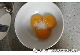2、将蛋黄内加入1/3的白砂糖,用打蛋器打散。