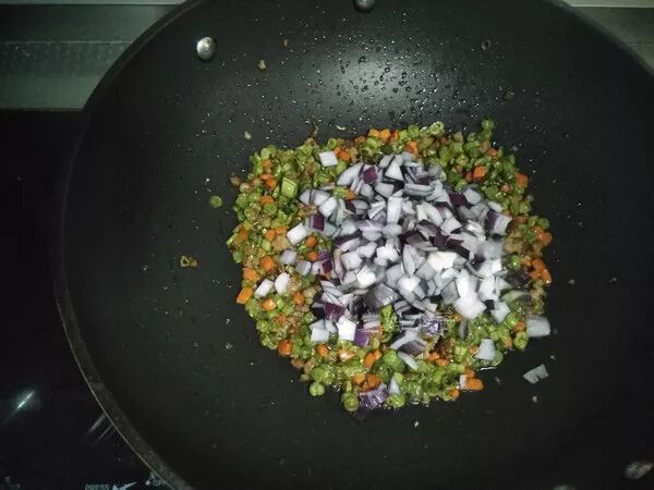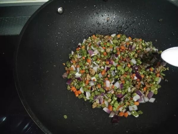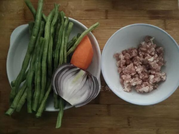 豆角切末、胡萝卜切小丁,洋葱切丁,再切点葱姜末