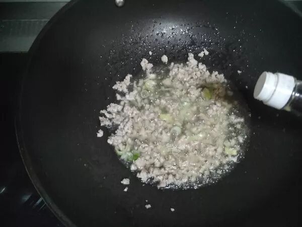 锅内加植物油,温热的时候放入肉馅、葱姜末炒香至肉馅发白,加酱油提色