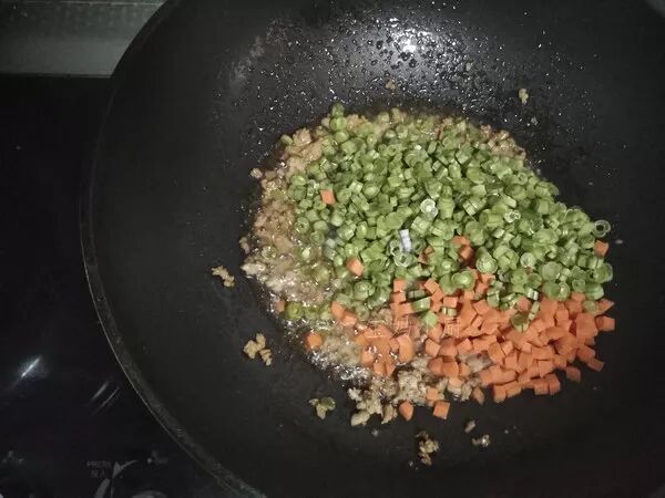 倒入胡萝卜丁、豆角大火翻炒至豆角断生,加两勺清水中小火烧一会