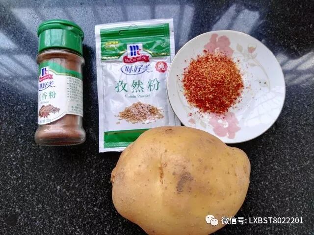 土豆300克、油适量、盐适量、五香粉适量、孜然粉适量、辣椒粉适量、葱花适量