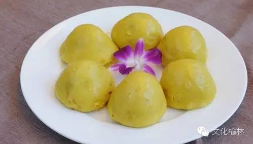 黄米馍馍是陕北地区特有的美食,其制作方法是先将硬黄米和少许软黄米按一定比例搭配浸泡一晚,捞出后磨成面,发酵后包上用红枣和豆类挤压合成的豆枣泥为馅料,揉成馍馍状,上笼蒸熟,颜色金黄,吃起来味道香软酸甜,久食不厌。央视《舌尖上的中国》播出后,捧红了绥德县黄国胜的黄馍馍,“黄老汉黄馍馍”一夜之间风靡全国,供不应求。
