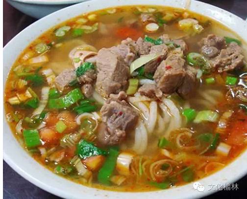 有句民谣“米脂的婆姨绥德的汉,清涧的石板瓦窑堡的炭,四十里铺的羊肉面。”可见,羊肉面在当地人眼睛里是多么重要的饮食。精选剔骨羊肉,切成小块,用草果、桂皮、花椒、生姜、红葱等佐料制成纯肉臊子,然后浇到厚薄均匀、筋道有嚼头的白皮面片上,喷香扑鼻,极为诱人。“绥德羊肉面”已成为知名美食。