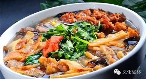 羊杂碎由羊的头、肚、肝、肺等混合烩制而成,味道酸辣兼宜,无腥不腻,连同粉条炖在汤里,撒上葱花,香味扑鼻而来,入口生津,食之可以增加人体热量,抵御寒冷,尤其适合在气候偏冷的北方食用。在榆林,榆阳区、神木、靖边、横山、绥德等县羊杂碎最为特色,且是当地人早餐必吃之美味。