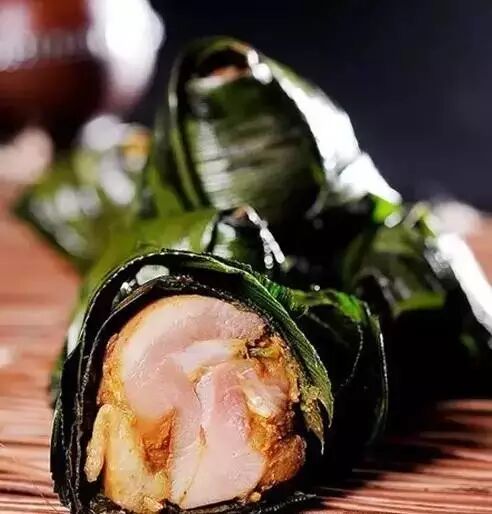 3、用泰国香兰叶将腌好的鸡腿肉逐个包成三角形状扎严。