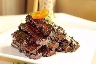 1、将猪肋排切长段,然后放入红卤水中,卤至九成熟捞出,再下入烧至六成热的油锅中炸制片刻,捞出。