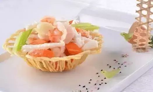 雀巢海中宝是一道广东的汉族传统名菜,属于粤菜系。此菜成菜后的形态较小,色泽粉白杏黄。清汁,虾仁鲜嫩腰果脆。