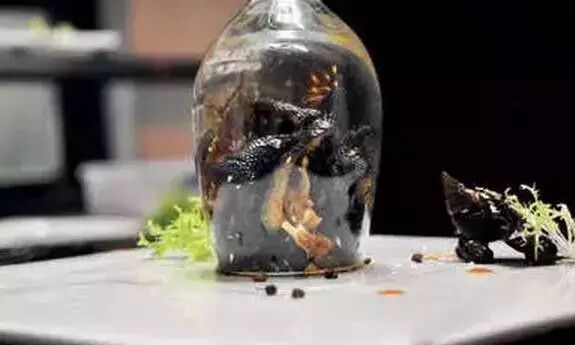 此菜属于改良版的泡椒凤爪,首先将原料换成了更有营养价值的乌鸡爪,然后根据江浙沪地区客人的口味,减少了部分麻辣度,为了凸显这一特点,用红酒杯搭配装盘,让客人一目了然。