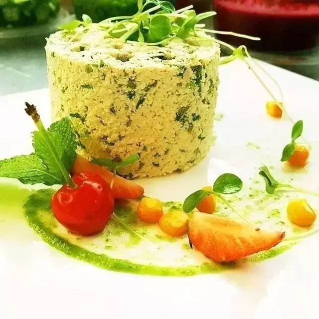 3.将鸡毛菜和豆腐放在一起,加少许盐、鸡粉、料油、香油拌匀,用煤球模具装盘,用樱桃、草莓、秋葵汁、香椿苗点缀即可。