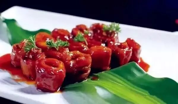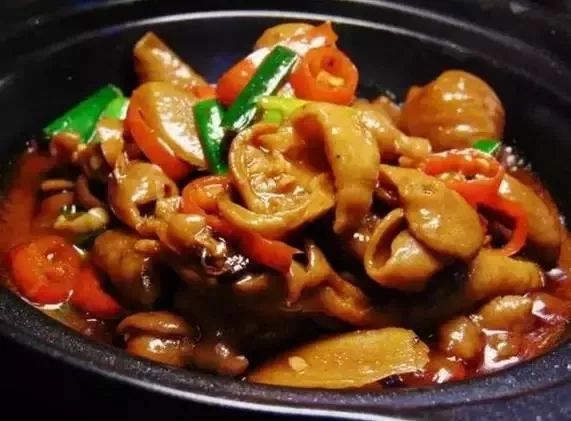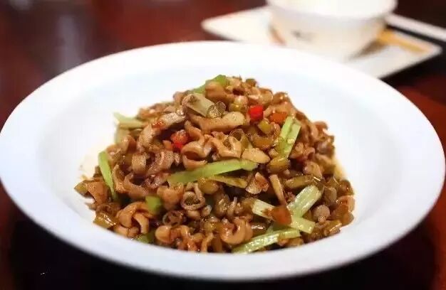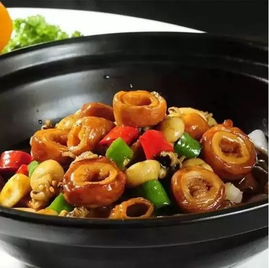 此菜选用肉头较厚且脆嫩的水发楠竹笋作辅料,入五香卤水锅卤至入味后,取出来切成丁,再入锅与卤过的肥肠块一起炒成菜。