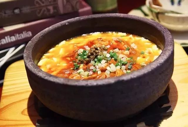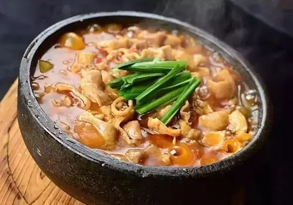 2、锅里入菜油烧热,投入葱末、姜末、泡椒末、豆瓣酱、泡姜末和泡菜末,炒香后掺入清水烧开,再把肥肠块放进去,另外调入盐、味精、鸡精和白糖,烧至肥肠熟透时,起锅盛入装有豆花的热石锅,放香菜点缀好上桌。