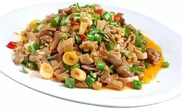 1.把扯去油膜的肥肠放进加有姜葱、料酒的沸水锅里,煮至刚断生便捞出来,冲净再切成块,随后放入加有化猪油的热油锅,炒至肥肠表面鼓胀时,出锅待用。