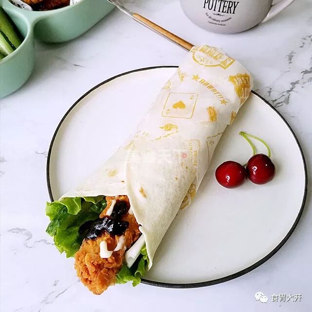 两边叠放卷好,用油纸包好,没有油纸不包也可以,那底下就折上一块收口,相信卷饼大家都会。