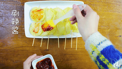 5.将辣酱均匀的刷在土豆片上,调料均匀的撒在薯串上,撒适量葱花即可