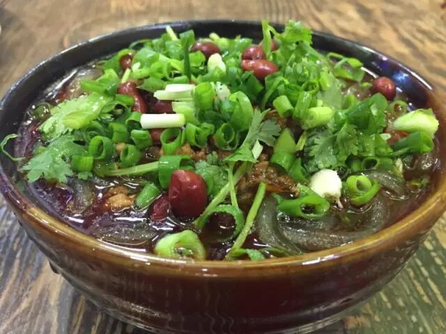 在重庆小面江湖中,有不少面痴钟情于它家的豌杂面,大妞就是其中一个。他家人气最旺单最高的招牌就是豌杂面了,端来一看卖相就已经百分之九十被征服,汤头是熬制数小时的鸡高汤,面是碱水面,加上多种调味料,放入豌豆、肉臊子、空心菜、花生、葱花等,麻辣味十足。一碗热气腾腾的豌杂面端上桌,运足气,一口吃到碗里见底。豌豆的软糯与面条的劲道及酱肉的香甜,令人回味无穷。