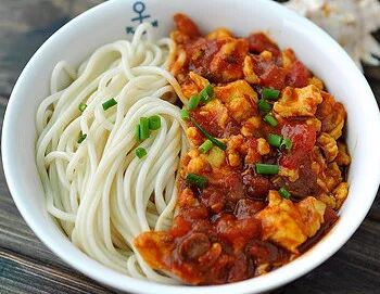 3. 煮好面条,浇上煮好的鸡蛋西红柿炸酱,吃的时候拌匀即可。