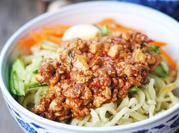 4. 面条煮熟后,捞碗内,上面放上做好的炸酱,吃的时候拌匀即可