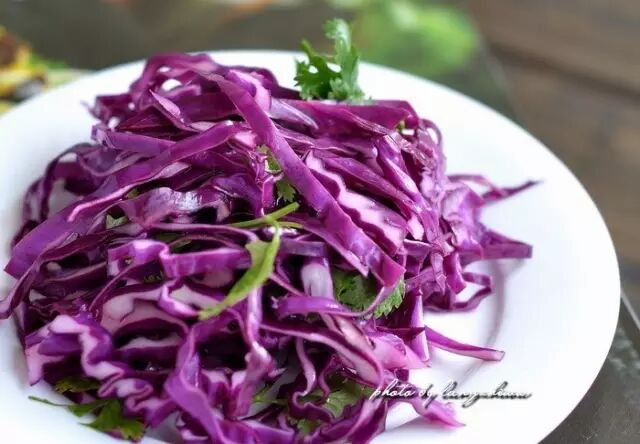紫甘蓝俗称紫包菜,是结球甘蓝中的一个变种。它的叶片呈紫红色,表面有灰白色蜡粉。由于品种的不同,结成呈现球形、扁球形、高圆球形。紫甘蓝包裹紧实,叶片肥厚,口感较脆,有微苦和微甜的味道。紫甘蓝最适合切丝后凉拌,制成沙拉。叶片加热后颜色会有改变。