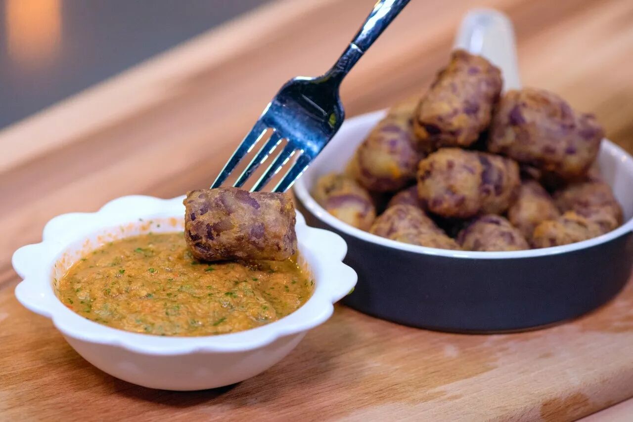 把土豆球盛盘,搭配微辣的酱汁,就可以享用这道经典小吃了。