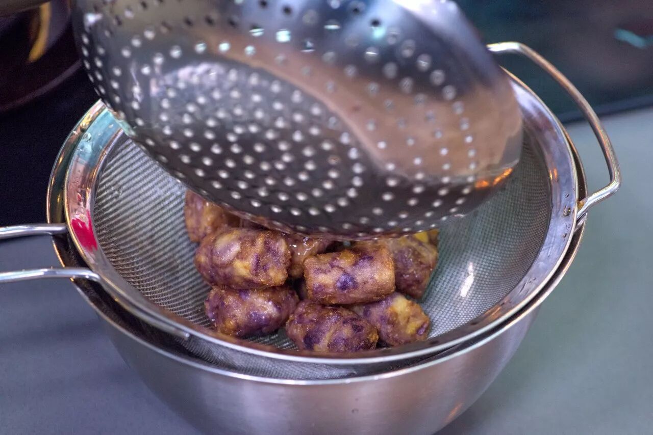 将捏好的土豆放入150℃的油锅中炸至外表焦黄。