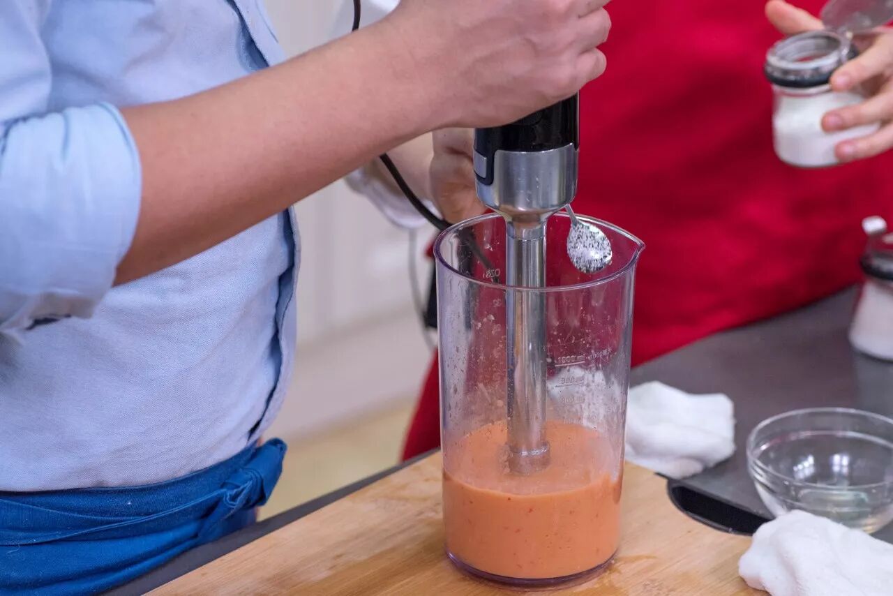 再次用搅拌器进行搅拌,搅拌均匀后酱汁就完成了。