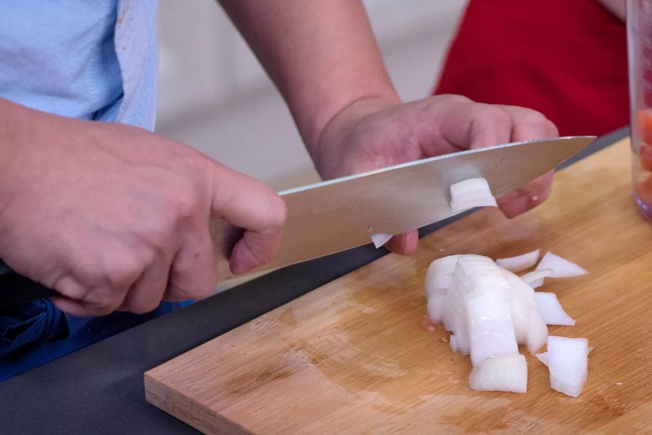 将切好的番茄、洋葱、辣椒、蒜放入料理杯中再放入适量墨西哥辣椒酱。