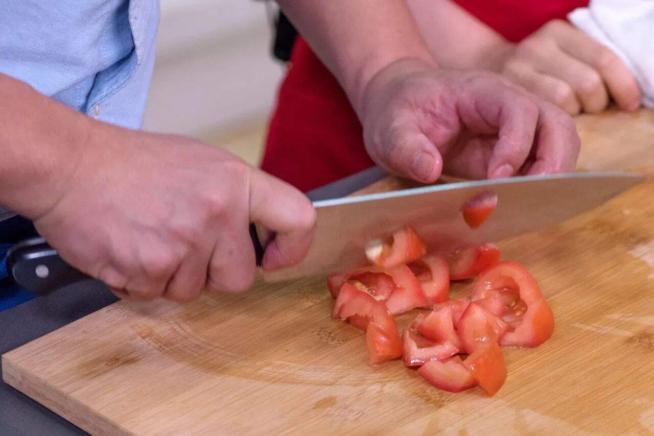 将番茄瓤用勺子挖出,再将去瓤的番茄切块。