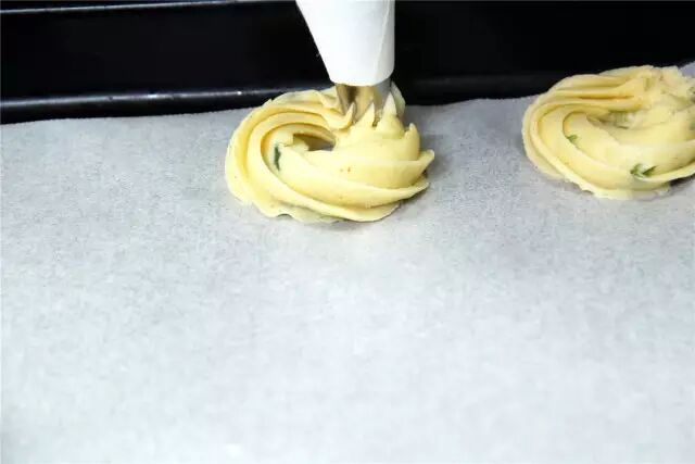 8、用橡皮刮刀翻拌均匀,将面糊装入曲奇袋,挤出空心的曲线即可