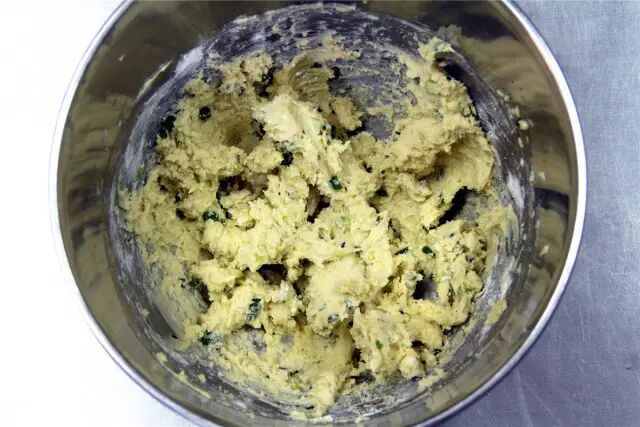 黄油150克、细砂糖40克、糖粉40克、鸡蛋50克、牛奶20克、低筋面粉200克、葱花20克、孜然粉3克、盐2克