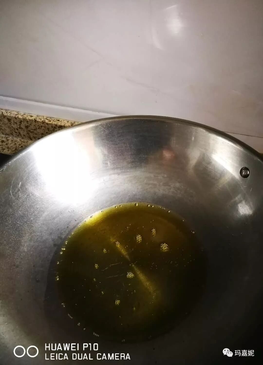 炒锅烧热、放入茶油或花生油(图中用的是山茶油),油温大约在60度左右时放入生姜丝、花椒、茴香、桂皮、炝锅。