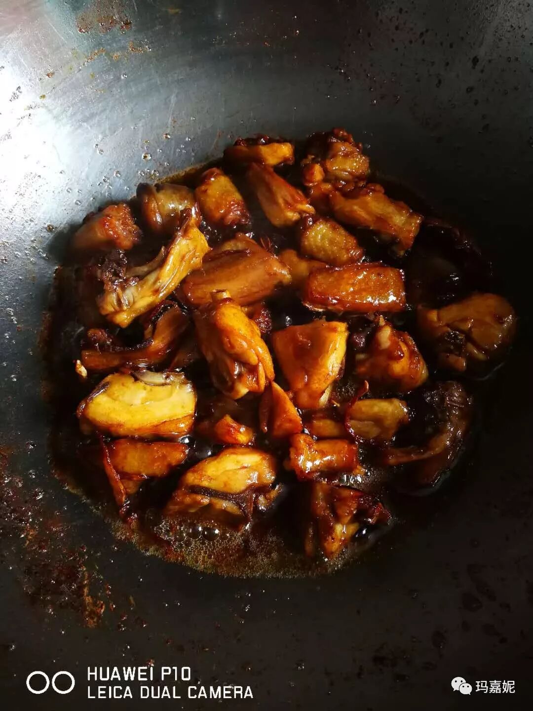放入腊鸡块翻炒,炒出香味,冒出油来,倒入生抽,中小火慢慢炒,有些粘锅时倒入开水(切勿用冷水或温水,肉会收缩,影响口感)