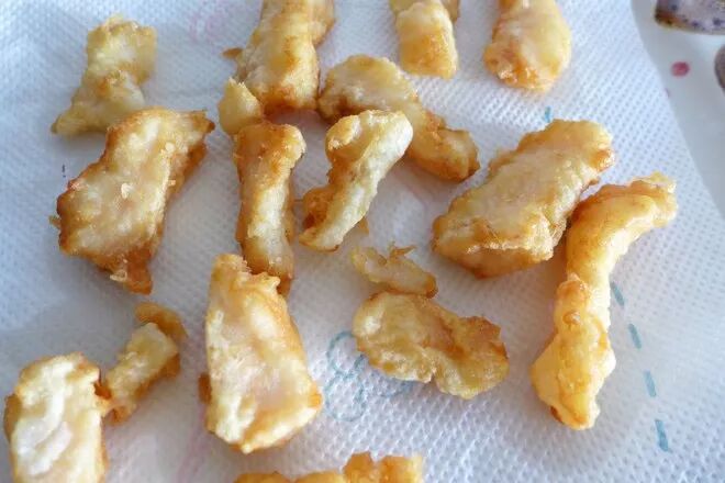 炸熟后的龙利鱼条用厨房纸吸干表面的油脂;