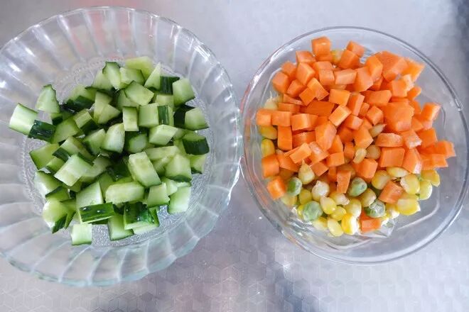 焯熟的豌豆粒、玉米粒控干水分备用;