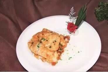 2、将腌好的鱼肉拍上淀粉30克,裹上蛋液30克;锅中入色拉油1千克,烧至六成热时,放入鱼肉,小火炸至色泽金黄,捞出控油,浇上香椿汁50克即可。