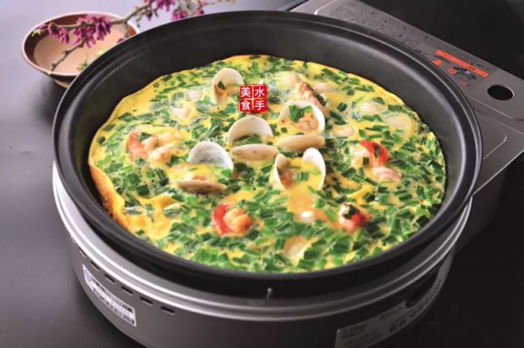 鸡蛋搅拌后加入韭菜末、蛤蜊、虾仁拌匀,上桌后堂烹。先大火加热2.5分钟,再小火加热0.5分钟,最后关火焖1-2分钟,成菜一面焦香,一面细软。