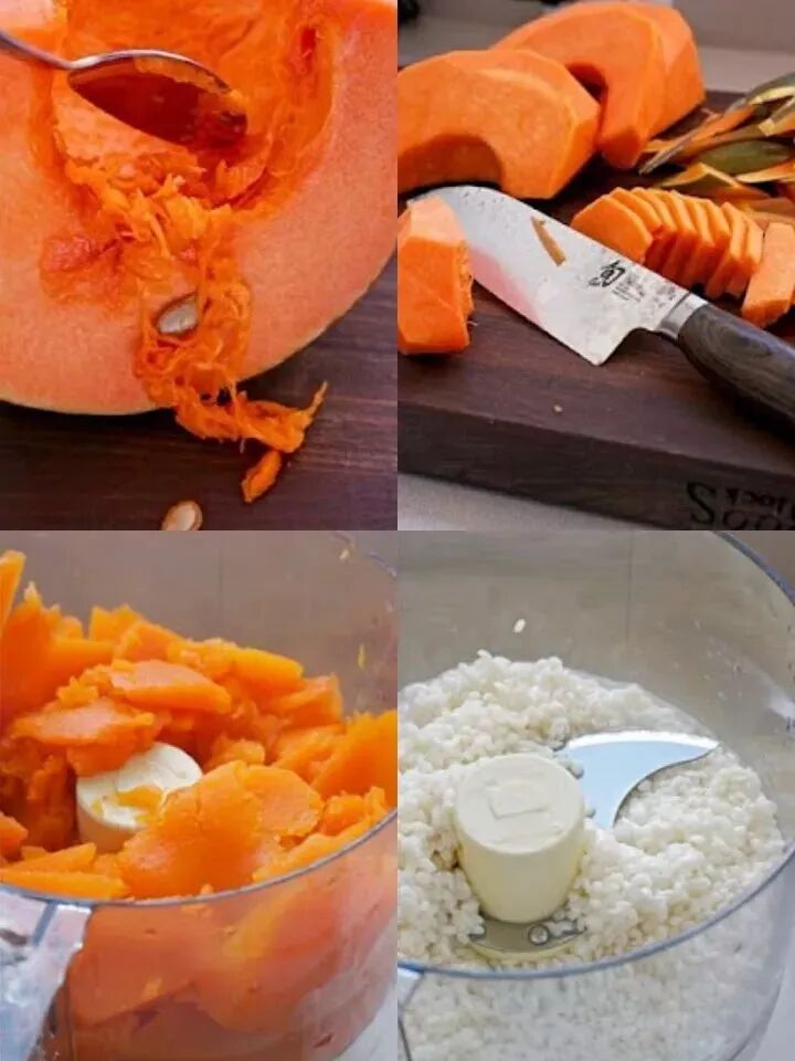 将南瓜去皮,去瓤切成块状。将南瓜片放入锅中煮熟捣成南瓜泥,大米洗净捣成颗粒状,将两个混合搅拌。