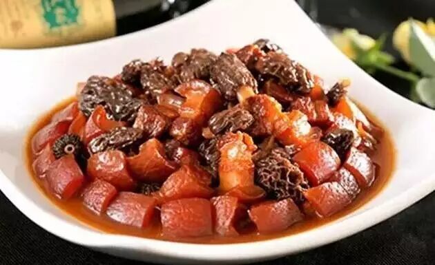 3、油锅烧至五成热,放入五花肉炸至金黄色,捞起,锅内留油,加入羊肚菌煸炒。再加入味精、酱油烧一会儿,加入肉汤煮沸,投入五花