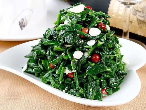 材料:菠菜300克、黑芝麻1大匙、盐、香油、醋、糖、鸡精。